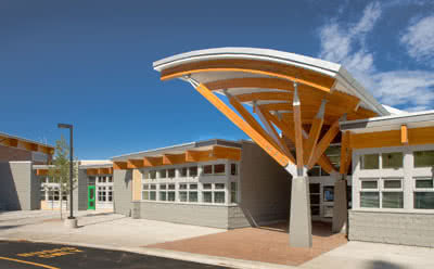 Comprised of a 33,000 square foot glue laminated timber frame elementary school and sports field.